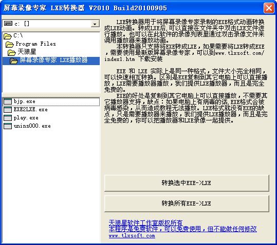 LXE转换器用于将屏幕录像专家录制的EXE格式动画转换成LXE动画。转成LXE后,可以直接在文件夹中双击LXE文件进行播放。也可以在此软件的录像列表里通过双击录像文件来调用播放器来播放动画。本转换器只支持将EXE转成LXE,如果需要将LXE转成EXE,需要使用最新版屏幕录像专家。
