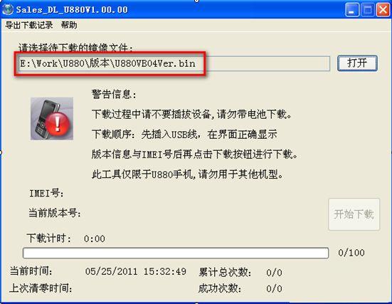 (3) 打开软件,并插入手机后,请不要在IMEI号显示出来前拔除设备,否则可能导致软件卡死。IMEI号显示后,在不点击升级按钮的情况下,直接拔出USB线,则对设备和软件没有任何影响。