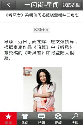 想了解最新最前沿的娱乐资讯?想参透明星们的穿衣法则?想和死党不见面也能聊天八卦?想知道最IN的时尚潮流?却总是没时间,那就来一闪街吧~资讯、明星、时尚、潮流,全都有!无论你是上班路上,排队、等朋友、或开会打发时间、领导讲话时溜溜号~~哪怕只看看20字的长标题,都能让你随手全掌握,谁还敢说你OUT?
