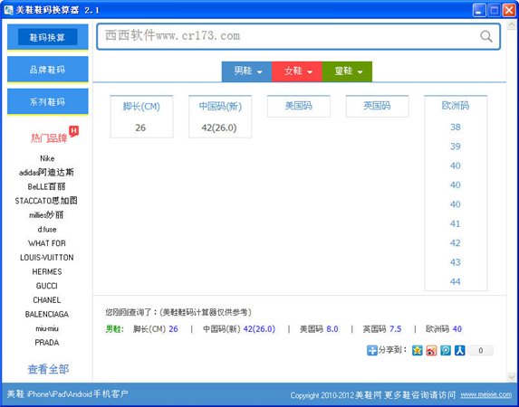 美鞋鞋码换算器 v2.1 绿色免费版 美鞋鞋码换算器对通用的鞋码进行了换算,还拥有近千款鞋子的尺码标识,完成美鞋鞋码换算工具,解决您在买鞋时尺码迷惑的困扰。 在美鞋鞋码换算器开发的过程中,我们发现鞋码不仅是中国码、新鞋码、美国码、欧洲码、日本码换算的问题,在不同的品牌,甚至不同的系列,不同的款式,鞋码换算都会有稍许差别。