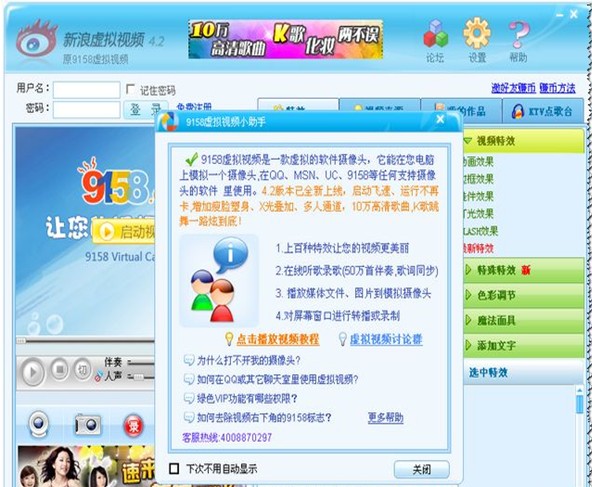 9158虚拟视频官方下载是一款虚拟的软件摄像头,适用于可视频聊天的所有软件(QQ、MSN、UC、9158聊天室等),外挂上百种特效,可对屏幕进行转播或录制,集听歌、录歌、播放视频图片于一体,收录10万首最新、最全的高质高清歌曲,是网络上最大的大众娱乐K歌软件!另外9158虚拟视频官方下载软件还与9158多人视频网站互动,只需免费注册一下,就能轻松拥有在线拍照、视频相册、视频游戏等9158的所有功能。