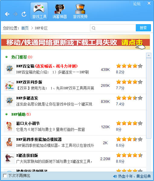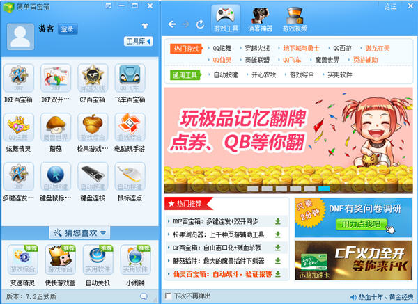 打开简单百宝箱,即可在左边框看见一些常见游戏辅助,dnf、cf、飞车……点击图标即可下载哦