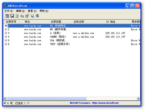 完全免费的DNS解析记录查看工具,支持批量DNS解析,允许你方便地检索指定域的DNS记录(MX, NS, SOA)。你可以使用你的互联网连接的默认DNS服务器,或使用你所指定的任何其他DNS服务器。检索所需的域的DNS记录后,你可以将其保存到文本/ XML / HTML/ CSV文件。另外,DNSDataView还支持批量DNS解析!