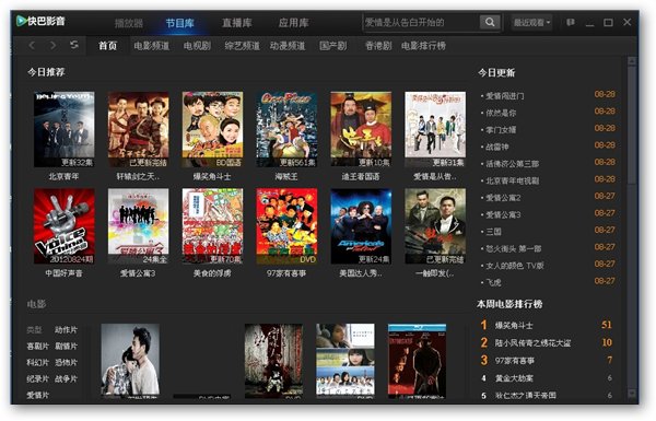 快巴影音是一款完全免费的高清影视、视频、电视播放软件。可观看上万部高清电影、电视剧,高清画质音效,一点就播。