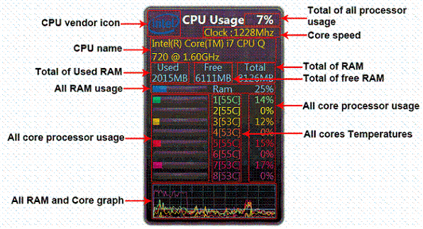 all cpu meter是一个可以监视处理器的运行状态的桌面小工具,以桌面外挂的图文形式来显示处理器内核使用情况,温度及内存占用情况以及CPU相关的各项数据。