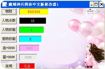 魔域神兵修改器可以修改角色多携带的金钱,还可以修改人物点数、人数技能、宠物技能。由于血和蓝在修改为整数时偶尔会出现错误,所以作者已经把数值修改好了,玩家可以的到血+9999和蓝+999W的效果