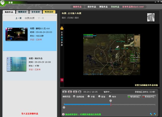 1.“傻瓜”式操作,1分钟学会发视频玩家宝宝集录像、编辑、发布一体化。完善的用户引导,便捷的软件操作,您只需要这一款软件,即能充分享受视频制作的乐趣!!