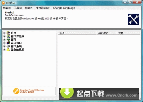 Fresh UI V8.82 多国语言绿色免费版 Fresh UI是一款优秀的系统配置、优化软件,为您提供数百种WindowsXP/2000/98/95/Me的隐藏设置选项。同时它还让您做到明明白白优化系统!您可以获得定制Windows用户接口、优化系统设置、优化硬件性能、定制Windows应用属性、通过策略Policies控制用户环境等方面的详细描述