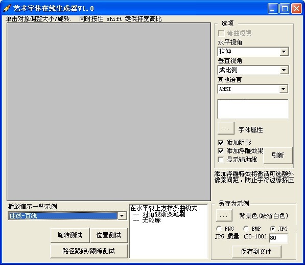 艺术字体在线生成器和word中的艺术字设计使用方法大同小异,设计好后选择保存格式并点击“保存到文件”按钮图片即可自动保存到软件根目录。本版本为绿色版,无需安装,使用完全免费,艺术字体在线生成器非常适合photoshop菜鸟使用。
