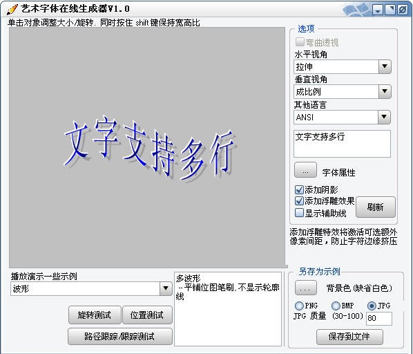 1、能够完全模仿word艺术字设计;2、支持多行;