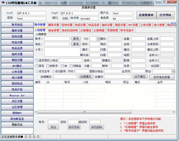 魔域gm万能工具 v3.2绿色版 魔域gm工具可以进行多项设置,如爆率设置、怪物设置、物品设置、抽奖设置、刷怪设置、人物管理、装备管理、账号充值卡等,是游戏玩家不可少的一款游戏辅助工具。