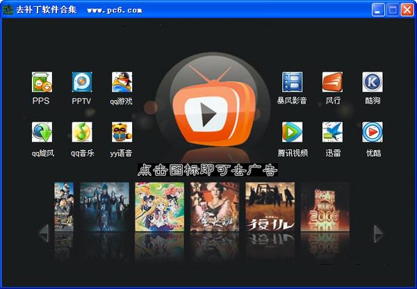 去广告软件这款去广告软件合集是集合了音乐播放软件及视频播放软件去广告补丁,本合集可以去广告的软件有pps网络电视、pptv、qq游戏、暴风影音、风行、酷狗、qq旋风、qq音乐、YY语音、腾讯视频、迅雷、优酷共12款软件,还在烦那些烦人的广告吗?赶紧使用去广告补丁吧。