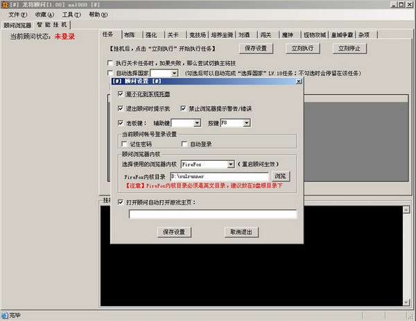 龙将顾问是一款龙将外挂辅助,浏览器型内置辅助功能,全后台运行、全智能辅助工具。集布阵、强化、关卡、竞技场、培养坐骑、对酒、闯关、魔神、怪物城、皇城争霸等功能,是快速冲新服的绝佳武器,是“龙将”最给力的辅助工具。