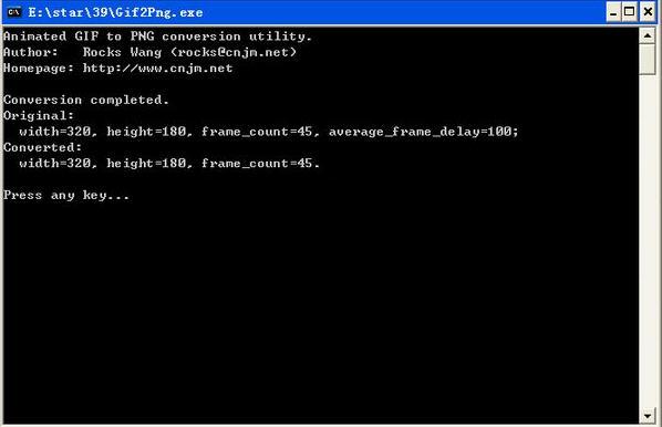 Gif转png(gif2png) V1.0免费绿色版 Gif转png工具是一款简单的Gif转换png格式的图像转换软件,使用方法非常简单,只需用鼠标拖拽这gif动态图片到本软件上(无需手动运行本软件,拖到图标上即可),松手就OK了,出现以下画面,按任意键结束,你就可以看到生成的png图片了。