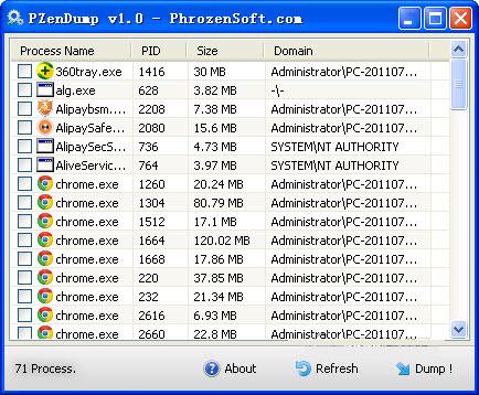 PZenDump是一款内存转储文件生成软件,它是小巧而又功能强悍的软件,可刷出你内存中的所有进程,点击dump将其转储为.dmp格式的文件。