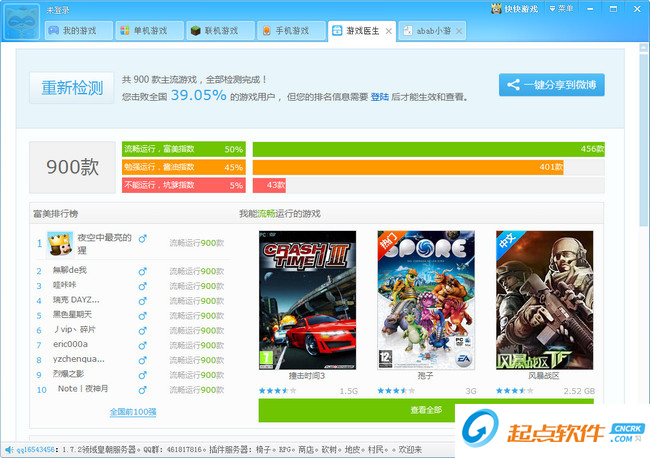 快快游戏医生,多玩YY联合快快游戏制做发布,全面支持市面热门游戏配置检测,云端参考数据实时更新,数据准确性业界第一,检测标准严格按照官方设定,检测结果真实有效。