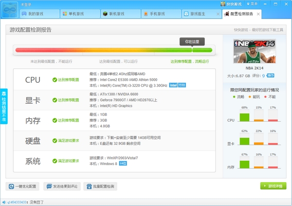 如果你对自己的电脑配置存在能否玩的了你心仪的游戏,还在拿不准自己的机器配置够不够?花了一晚上下载的游戏能不能启动?会不会死机、花屏?只需要桌面打开软件后在搜索框输入希望检测的游戏名称后点击“立即检测”,也可以在“热门游戏”或字母排序表中点击需要检测的游戏名称。好啦~~~测试结果出来了!看看你的机器能跑得起来吗?游戏配置测试报告里,除了按CPU、显卡、内存、硬盘、系统分类显示是否达标外,还参考其他用户的机器反馈数据,通过数轴和图表对比的方式给你更多参考信息,的确非常直观!