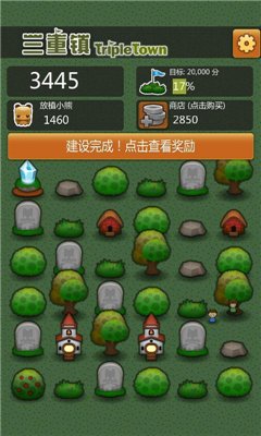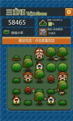 点击空地可以放置当前元素,三个可以消除生成一个高级物品,注意:你放置最后一个物品的地方将会是生成的高级物品出现的地方。 草合成草丛,草丛合成树,树合成小屋 如果由超过三个的物品合成新的物品,这样的新物品会看起来跟普通三个合成的不一样,显得高级一点,但用法用途一样,只是你的分数会增加。例如: 三棵树合成的普通民居。