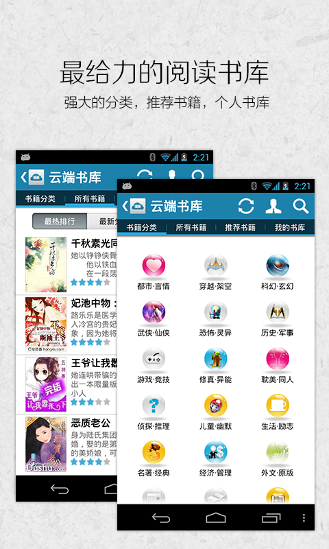 6、热门排行、最新书籍、评分排行、分类书籍、我的书库,强大的云端书库功能,随心所欲、免费下载。