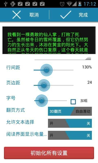 3、多个主题样式,阅读更多好心情,并分别设置了白天和夜晚主题,一按就切换。也可以设置晃动切换主题,阅读也要酷到底。
