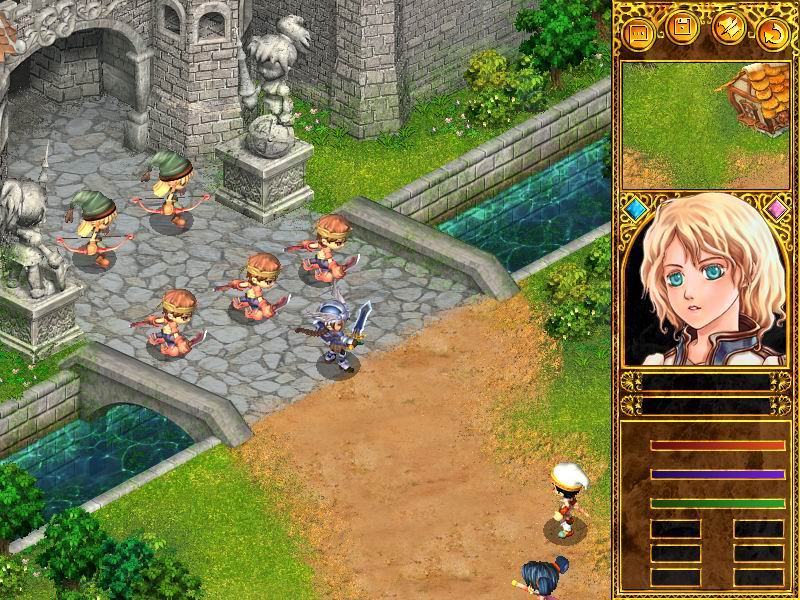 首先左边的桥头和右边的河边的敌人先会向中间靠拢,然后盟军在最左边的那个人肯定是保不住了,因为敌人的一次攻击就有300多,几个人一围他肯定活不下来,所以也不用可惜,然后就是赫拉瞎跑,由于赫拉的职业是骑士,行动速度很高,而且她总乱跑,所以牧师就要追着她加血,而牧师又很容易死,没有办法了,这个时候也顾不上这些,在三个回合后,两边的人就能够交手,当然敌人非常的强,用人海战术围她们,先打占星师一类能够加血的职业,然后才是战士,多利用三个高等级的职业。等到周围的散兵游勇都消灭干净后,就可以向中间的那6个人出发了,她们其中有一名召唤师,能够召唤怪兽大面积的攻击,而且攻击力超强,于是在靠近中间这部分敌人的时候千万不要太集中,否则就是集体的毁灭性攻击,当然本场战斗中伤亡可能也是最严重的,笔者最好的一次也只留下了6个人,其他的人几乎被秒杀,当然本场战斗的另一个难度就是要保护妮雅和赫拉。最好让妮雅学会加血技能,这样可以专心照顾赫拉,终于将玛西亚打倒。