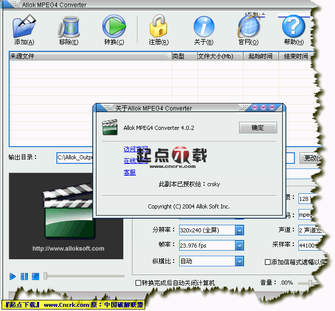 Allok MPEG4 Converter v4.1.0 汉化版 强大的视频转换工具,可将所有流行格式的视频文件转换为MPEG4格式文件,使其可在iPod, Sony PSP, Cellular Phone, Pocket PC, Palm等设备中播放。支持DivX, XviD, AVI, WMV, MPG, MPEG, MP4, M4V, FLV, 3GP, ASF, RM, RMVB, MOV, ASX, SVCD, VCD, VOB 等格式。