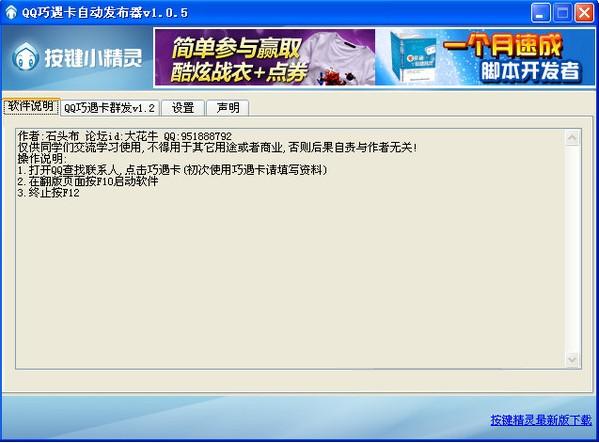 QQ巧遇卡辅助 v1.2绿色免费版 QQ巧遇卡是qq2012最新的一个功能,这款QQ巧遇卡辅助可以自动发布消息,按下F10就等着帅哥美女来与你巧遇吧。