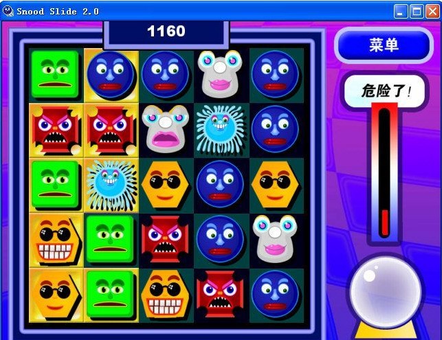 怪脸挪移(Snood Slide)是一个全新的益智消除游戏。你的目标是把整个板面变成金色,通过形成三个或三个以上相同怪脸的组合来办到。你能成行或成列地挪动以形成怪脸的组合。但是要提防可能阻碍你行动的骷髅头!这些骷髅头是由部分怪脸变成的,消除骷髅头周围的怪脸可以使它裂开以至碎掉。游戏进行中还会出现超大的怪脸以增加难度。点击水晶球提示时会有机器人出来替你完成一次操作,让你在难度较高的关卡不至于无所适从。