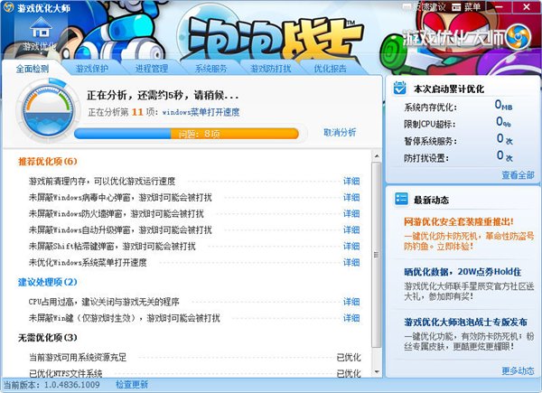 游戏优化大师泡泡战士专版 v1.0.4836.1009 官方版 游戏优化大师泡泡战士专版,强大的一键优化功能,更少的资源占用,让您的游戏体验更加畅快!