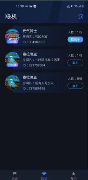 4、当你加入房间或者自行创建房间后,能在【联机】页面查看到已有的房间。点击进入房间详情,接着点击【联机】按钮,这样就与房间内的成员联机成功了。