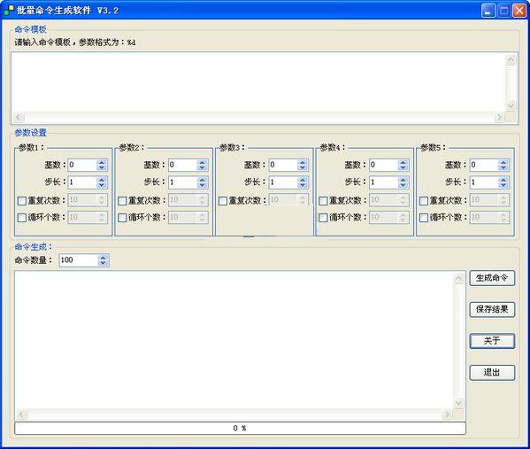 最新的批量命令生成软件,支持参数重复和循环。绿色软件、功能更强大。 网络工程师批量调试设备工具之一,支持自定义8个参数。很好用,适合在配置交换机的时候生成多个接口的配置脚本。