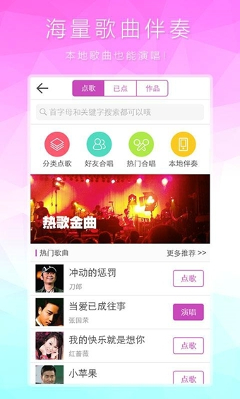 4.高效的社交:《爱唱》内置强大的社交系统,让您能够快速方便的锁定和关注您所喜欢的歌手和歌曲,分享给您的粉丝朋友。强大的社交功能也让您能够快速准确的推销自己,在圈子里占领自己的地盘。