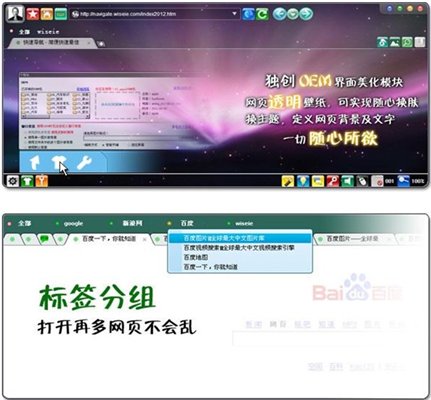 创新:全国首创Wisestyl排版引擎,原创国产第一品牌。独有双层分组标签,井井有条标签操作绝无竟有。页面 定时系统,网页加密保存,合并网页等108项创新功能保证上网快速,安全,稳定。
