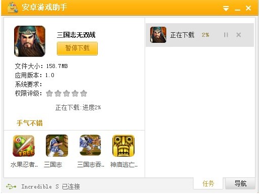 安卓游戏助手的安装包只有1.5MB大小,轻巧的体积让它能秒速启动,快速通过USB数据线与手机连接,并瞬间安装所需的游戏文件,游戏大资源包打包下载一键安装,不会带给用户冗长繁复的使用体验,让用户真正享受到手游与众不同的快乐。