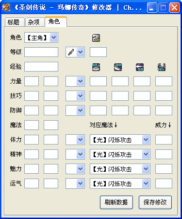 圣剑传说玛娜传奇修改器功能: 修改人物角色的等级,经验,力量,技巧,防御,魔法,体力,精神,魅力,运气等 杂项修改,金钱无限,技力不减,神速回血,材料修改,材料数量修改,技能修改等