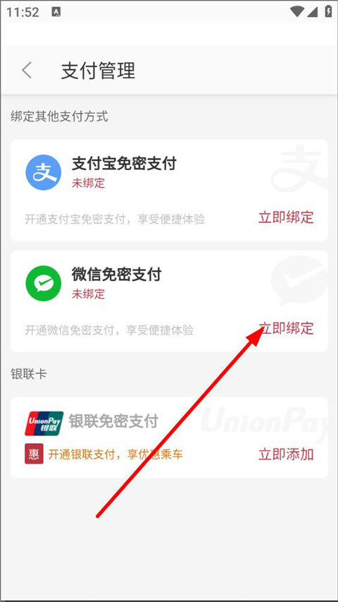 3、在支付管理页面中,用户需绑定支付宝、微信或银联卡(任选其一),然后点击立即绑定;