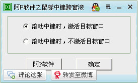 阿P软件之鼠标中键跨窗滚 1.13 绿色版 鼠标中键跨窗滚运行本程序后,无需激活目标窗口,只需将鼠标指针划到目标窗口任意位置(无需点击),滚动鼠标中键即可操作目标窗口纵向滚动条。用户亦可选操作目标窗口时是否自动激活该窗口。