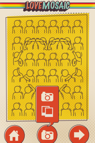 打开软件,点击创建新图像,屏幕上分成36个小方框,还显示出人物拍照的大致动作和位置。点击每一个小方框,手机将打开相机,同时屏幕上显示出一个简易的人物轮廓,你只要根据这个轮廓摆造型,另一个人进行拍照,需要两人配合完成。拍好的照片会自动保存到拼图画面上,完成所有步骤,整张爱心图片就完成了。