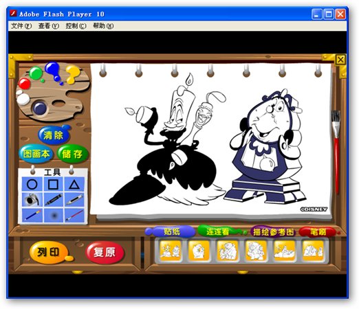 儿童画画填色软件带有六个描绘参考图,贴纸,笔刷,画笔,可以更换颜色,功能方面可以清除,可以复原。使用也很简单,对于小朋友来说还是很好玩的呢。 经典的画板小游戏。用你灵巧的双手,画出美女与野兽的浪漫故事吧。