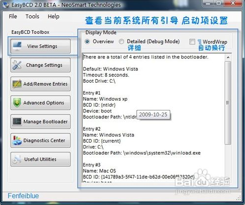 1.打开EasyBCD默认显示的是ViewSetting,可以查看当前所有的启动项信息。