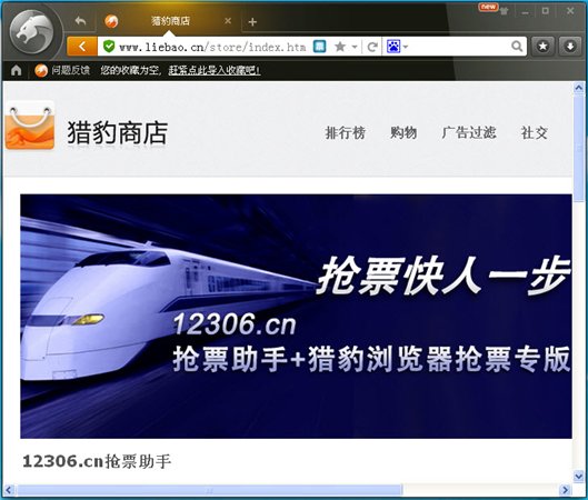 猎豹浏览器抢票专版,内含抢票助手第三方应用扩展,可帮助网民最快地捕捉购票良机,还可极大地省去手工刷票时的焦急而又机械的操作。