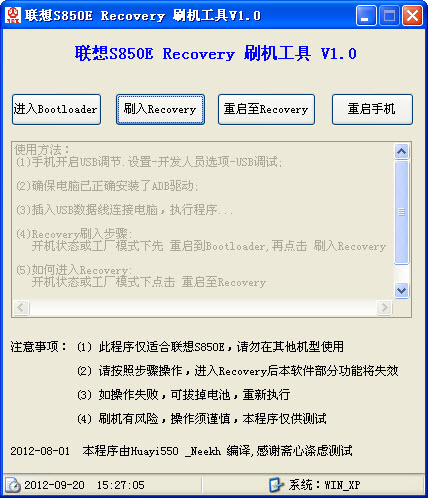 1、使用数据线连接手机至电脑,手机开启USB调试模式(设置---开发人员选项---USB调试)2、打开联想S850E Reconery刷机工具。