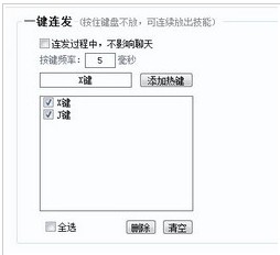 开启工具之后的,选择界面下方的“连发”标签进行一些连发设置。在添加热键的左边输入框里选中,然后按下你需要设置连发的键,比如一般的“X键”,点添加热键按键。设置完成。若需要使用不影响聊天系统,可以勾选上。点右边的“开启连发”,也可以在下面的“开启/关闭 键”中设置功能开启的快捷键。
