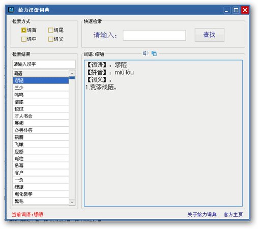 给力汉语词典是绿色免费软件,收录词语41万多条,是目前收录最多的新华词典、汉语大词典。每个词条都有详细的拼音和解释;可按词首、词尾、词中、词义检索。程序自带中文真人语音朗读功能,词语及解释可以进行全文朗读,是一个优秀的学习工具。