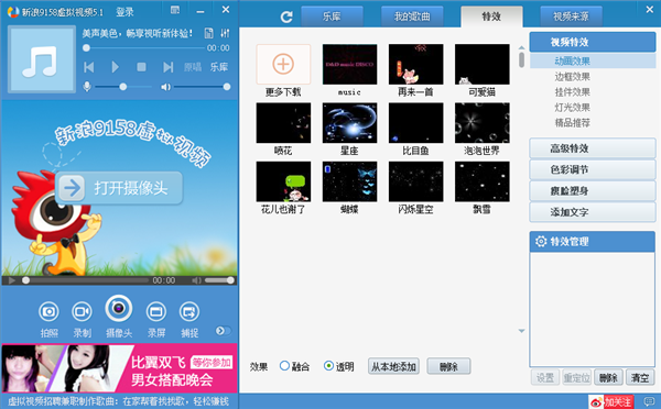 9158虚拟视频官方下载正式版可在QQ、MSN 、新浪UC、9158等任何支持摄像头的软件既聊天室中使用。可对你的视频、照片等添加多种超酷视频特效,对屏幕窗口进行转播或录制,你可以与远方的朋友分享你电脑上的精彩视频、照片、动画、Flash 甚至桌面都可以展现给网友。