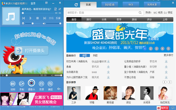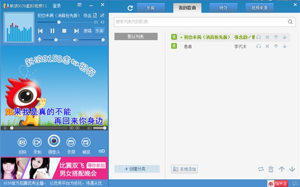 9158虚拟视频是一款多功能虚拟摄像头软件,它能在您电脑上模拟一个摄像头,在任何支持摄像头的软件、聊天室里使用。9158虚拟视频官方下载正式版集听歌、录歌、播放视频图片于一体,收录10万首最新、最全的高质高清歌曲,是网络上最大的大众娱乐K歌软件。