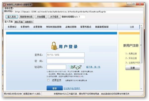 铁路网上购票排队提醒器是为了给买火车票的用户及时提醒前面剩余的排队人而研发的实用小软件,送给有需要的朋友。