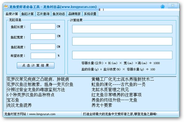 龙鱼爱好者工具是龙鱼村根据饲养龙鱼中常遇到的鱼缸计算、温度计算、盐度计算、芯片查询等常见计算、查询方式。龙鱼爱好者工具更方便了龙鱼爱好者饲养自己的龙鱼。
