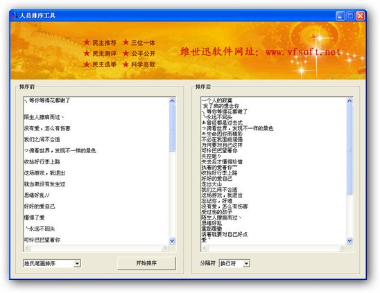 姓名排序工具是给姓名排序的绿色小工具,只需将所有姓名复制粘帖在软件里,提供四种样式的排序格式,可按姓氏笔画排序、按姓名笔画排序