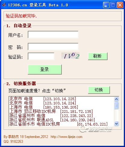 12306.cn登陆工具 beta V1.0 绿色免费版 12306登陆器12306 辅助登录小工具会自动不断登陆直到成功。内置了 12306.cn 几个省市的 IP 地址,可以手动切换以达到加速的目的,需要手动输入识别验证码。